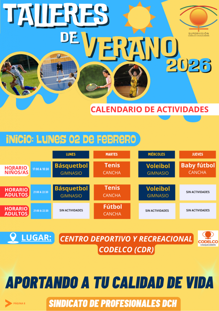 El programa veraniego contempla una variada oferta de disciplinas deportivas, entre ellas básquetbol, tenis, voleibol, baby fútbol y fútbol, con horarios diferenciados en jornada de tarde y noche. Las actividades se realizarán en el Centro Deportivo y Recreacional de Codelco (CDR).